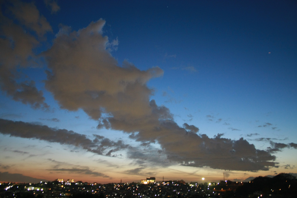 なんだかたまらない空の色と雲で、f3.5、1/1sec、手ぶれの限界を超え、